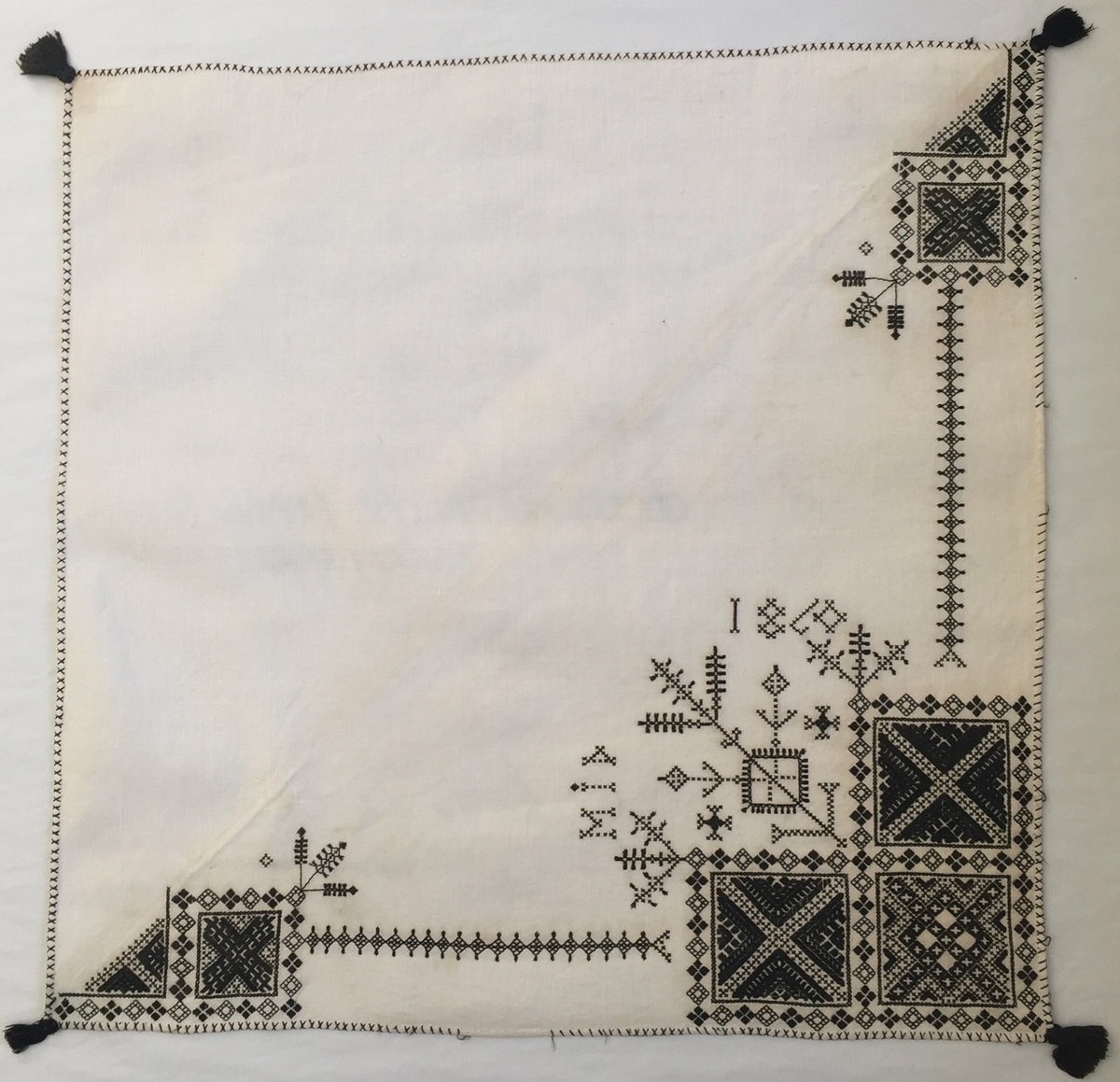 Geometriskt mönster i kvadrater i hörnen, en bård mellan kvadraterna på ryggsnibb och framsnibbar. På ryggsnibben tre kvadrater och en majstångsspira samt märkning med årtal och initialer. På varje framsnibb en kvadrat och en trekant. Fyra ornament.