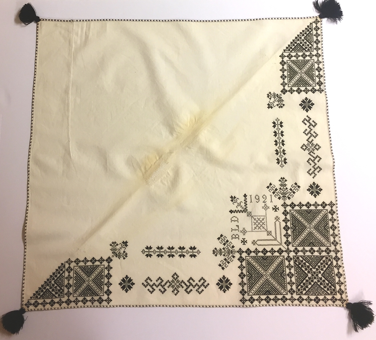 Geometriskt mönster med blomsterliknande inslag i kvadrater i hörnen, två bårder mellan kvadraterna på ryggsnibb och framsnibbar varav en med svastikaliknande mönster. Runt kvadraterna en bård med blomsterliknande mönster. På ryggsnibben tre kvadrater och en majstångsspira samt märkning med årtal och initialer. På varje framsnibb en kvadrat och en trekant. Sex ornament.