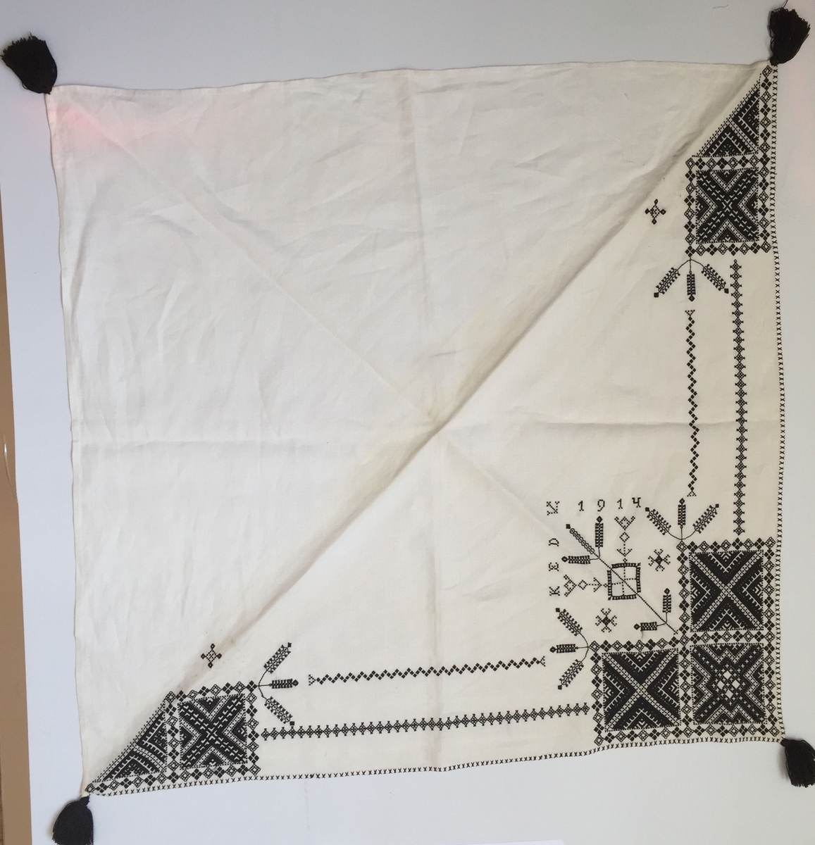 Geometriskt mönster i kvadrater i hörnen, bårder mellan kvadraterna på ryggsnibb och framsnibbar. På ryggsnibben tre kvadrater och en majstångsspira samt märkning med årtal och initialer. På varje framsnibb en kvadrat och en trekant. Ornament i korsstygn och plattsöm.