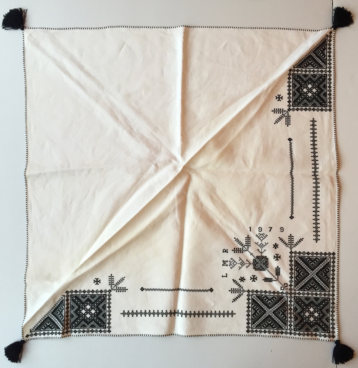 Titel: Geometriskt mönster i kvadrater i hörnen. Två bårder mellan kvadraterna på ryggsnibb och framsnibbar. På ryggsnibben tre kvadrater och en majstångsspira samt märkning med årtal och initialer. På varje framsnibb en kvadrat och en trekant. Sex ornament