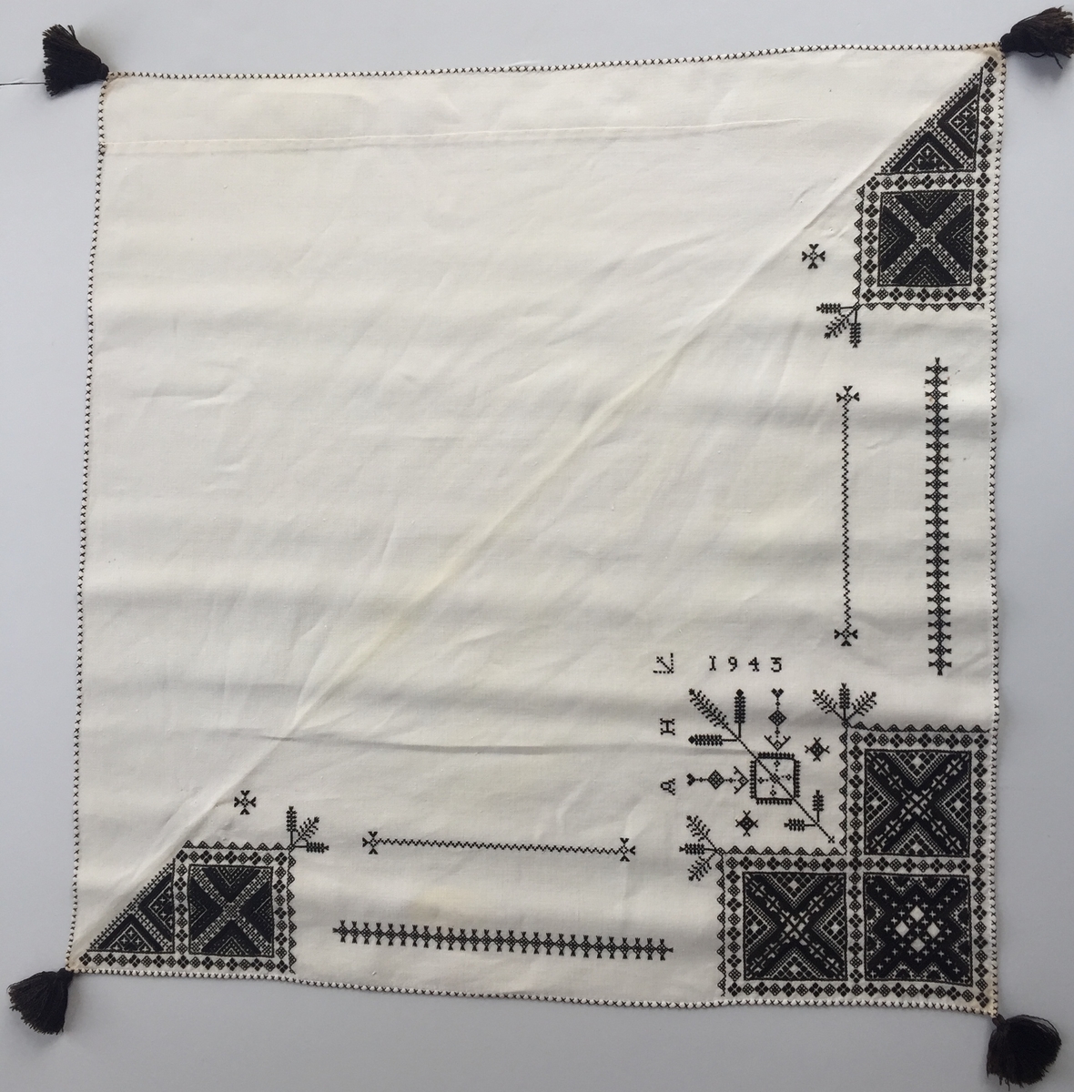 Titel: Geometriskt mönster i kvadrater i hörnen. Två bårder mellan kvadraterna på ryggsnibb och framsnibbar. På ryggsnibben tre kvadrater och en majstångsspira samt märkning med årtal och initialer. På varje framsnibb en kvadrat och en trekant. Fyra ornament