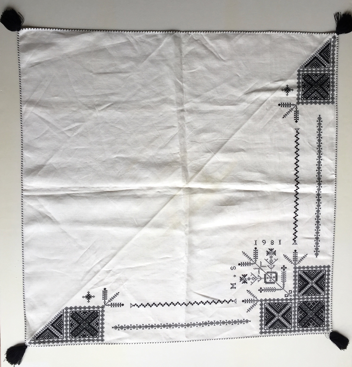 Geometriska mönster i kvadrater i hörnen, två bårder mellan kvadraterna på ryggsnibb och framsnibbar. På ryggsnibben tre kvadrater och en majstångsspira samt märkning med årtal och initialer. På varje framsnibb en kvadrat och trekant.