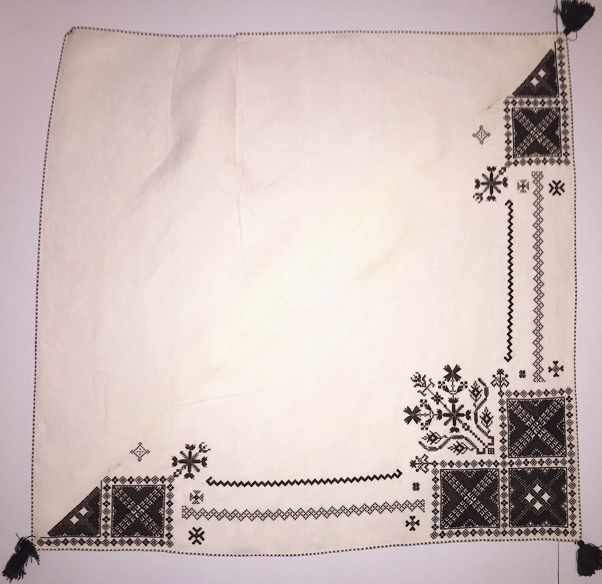 Geometriskt mönster i kvadrater i hörnen, huvudsakligen i rätlinjig plattsöm. Två bårder mellan kvadraterna på ryggsnibb och framsnibbar. På ryggsnibben tre kvadrater och blomsterspira . På varje framsnibb en kvadrat och en trekant. Tio ortnament.