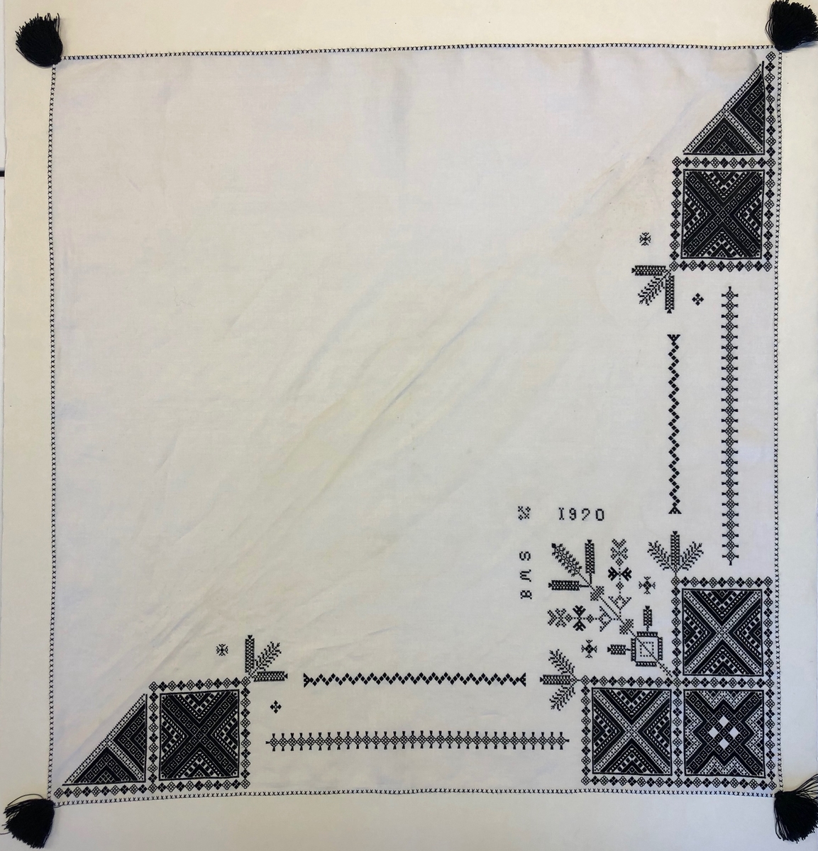 Titel: Geometriskt mönster i kvadrater i hörnen. Två bårder mellan kvadraterna på ryggsnibb och framsnibbar. På ryggsnibben tre kvadrater och en majstångsspira samt märkning med årtal och initialer. På varje framsnibb en kvadrat och en trekant. Sju ornament