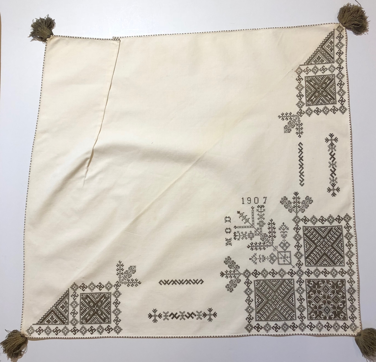 Blomsterinspirerat mönster i kvadrater i hörnen. Runt kvadraterna bård i blomstermotiv. Mellan kvadraterna på ryggsnibb och framsnibbar två bårder. På ryggsnibben tre kvadrater och en dekorerad majstångsspira. På varje framsnibb en kvadrat och en trekant.