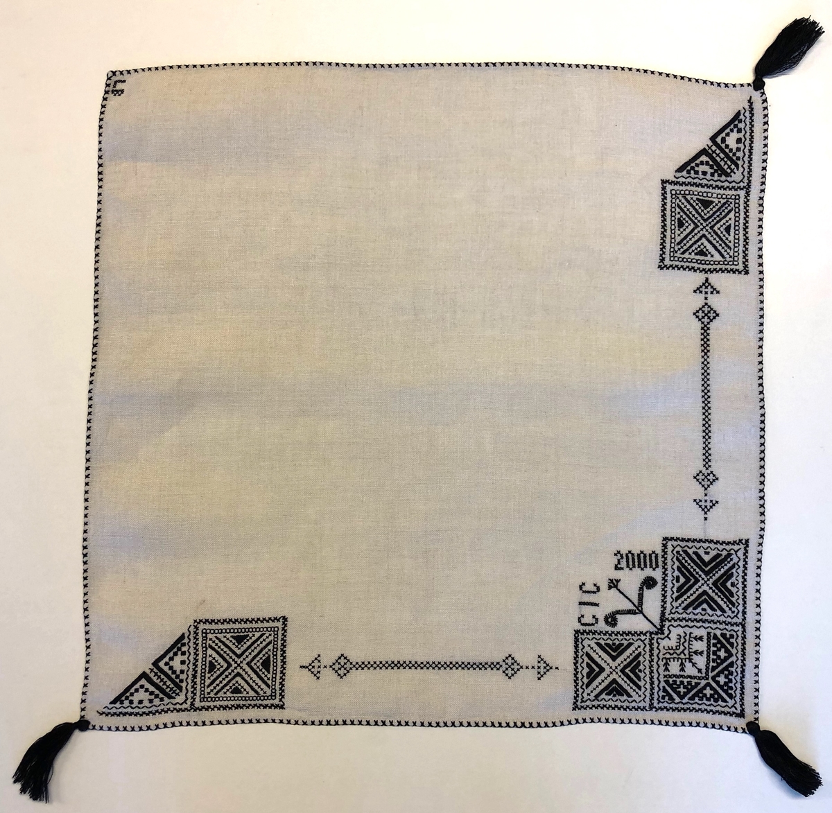 Geometriskt mönster i kvadrater i hörnen. En bård mellan kvadraterna på ryggsnibb och framsnibbar. På ryggsnibben tre kvadrater och en enkel spira samt märkning med årtal och initialer. På varje framsnibb en kvadrat och en trekant.