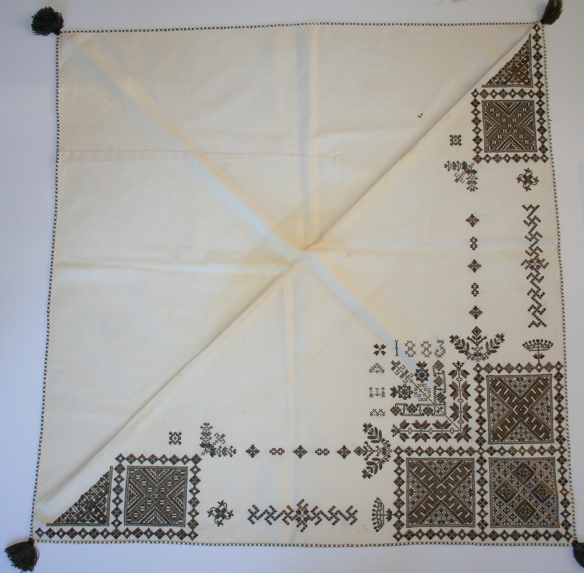Geometriskt mönster med blomsterliknande inslag i kvadrater i hörnen, två bårder mellan kvadraterna på ryggsnibb och framsnibbar varav en med svastikaliknande mönster. Runt kvadraterna en bård med blomsterliknande mönster. På ryggsnibben tre kvadrater och en majstångsspira samt märkning med årtal och initialer. På varje framsnibb en kvadrat och en trekant. Femornament.