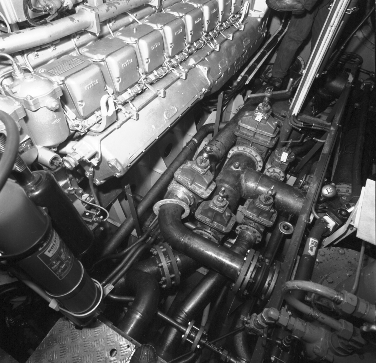 Interiör av maskinrum och lyft av motor på kustkorvetten \\K 11 Stockholm\\\\anm neg ingår i en serie om 65 st varav 5 st scannats, detta är neg nr V 99236 /gp