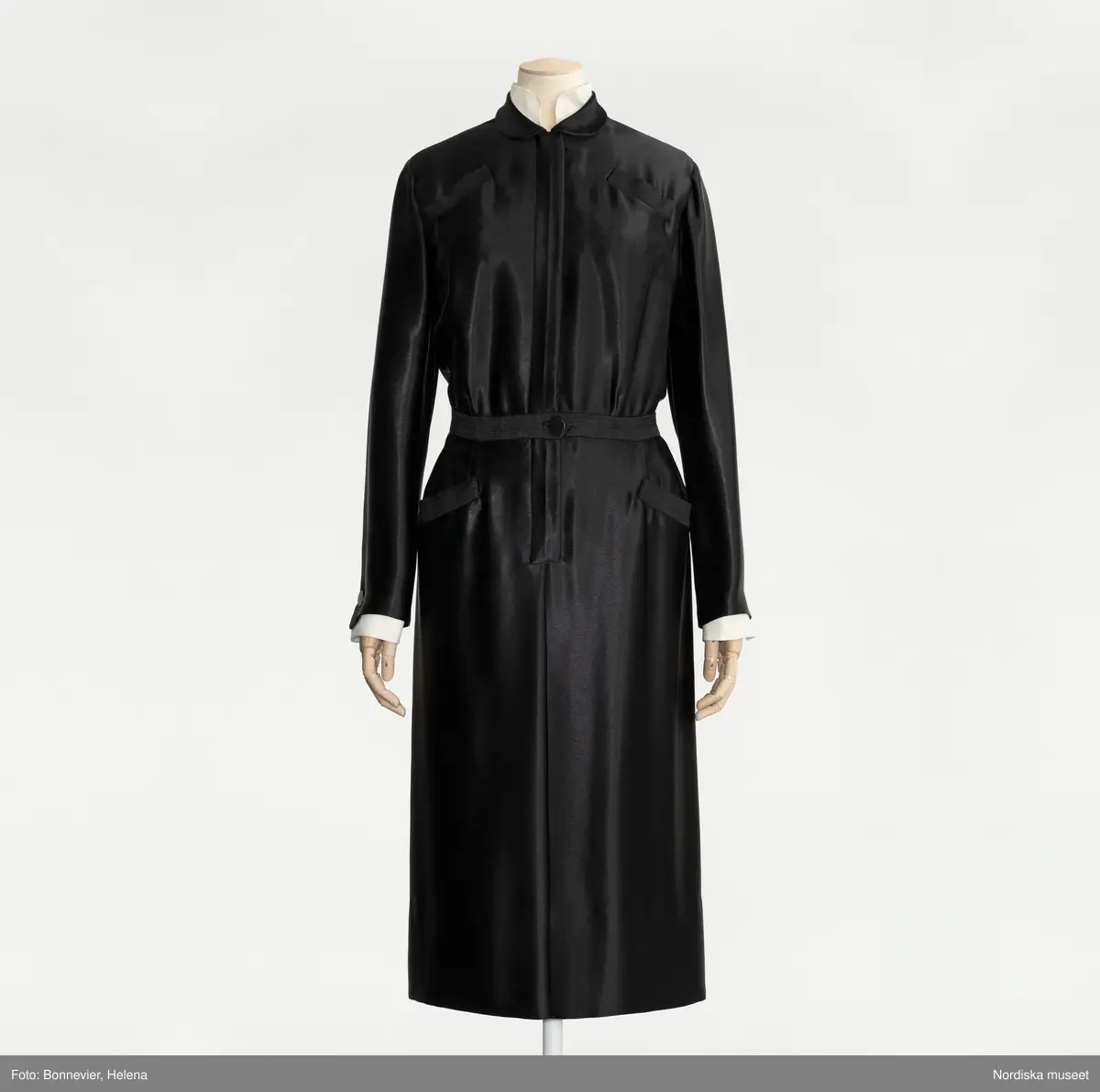 Svart sidenklänning med vit krage och manschetter. Beställd från NK:s Franska damskrädderi av Else Kleen Möller (1882-1968), samhällsdebattör och modejournalist. Levererad oktober 1954.