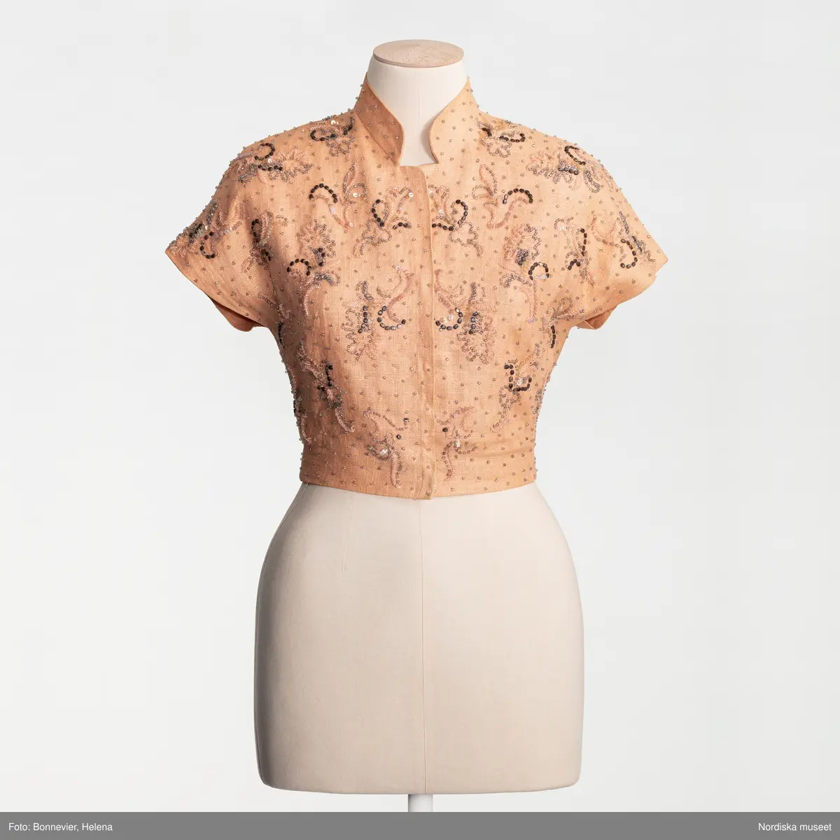 Bolero monterad på docka. NK:s Franska damskrädderi. Laxrosa råsidenbolero med pärl- och paljettbroderier från 1949, uppsydd efter ett original från Jacques Fath. Pelle Lundgrens fru Tyra Lundgren f. Jacobsson (19011978), tillika Kurt Jacobssons syster, bar boleron till en rökfärgad tyllklänning från NK:s Franska på Zarah Leanders dotter Boels bröllop. Klänningen har tyvärr gått förlorad. Privat ägo.
