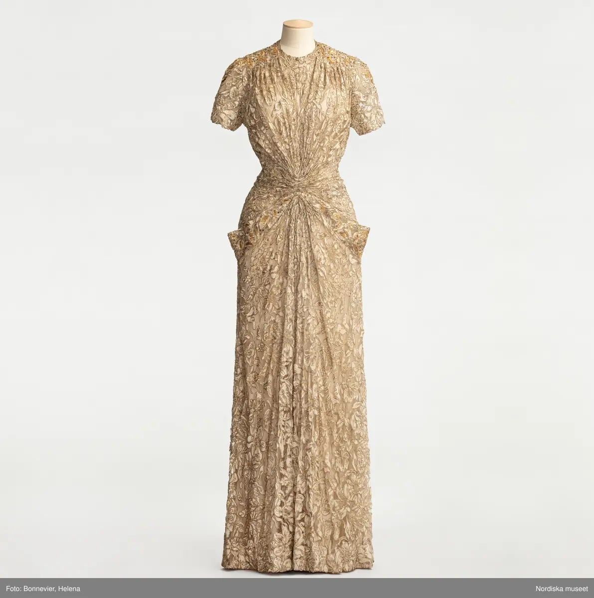 Aftonklänning av skir guldspets med paljett- och pärlbroderi på axlar och höftparti, kort ärm och rynkning mot livet. Beställd från NK:s Franska damskrädderi av Ella Ros född Littorin (1898-1977). Levererad 1941-1942.