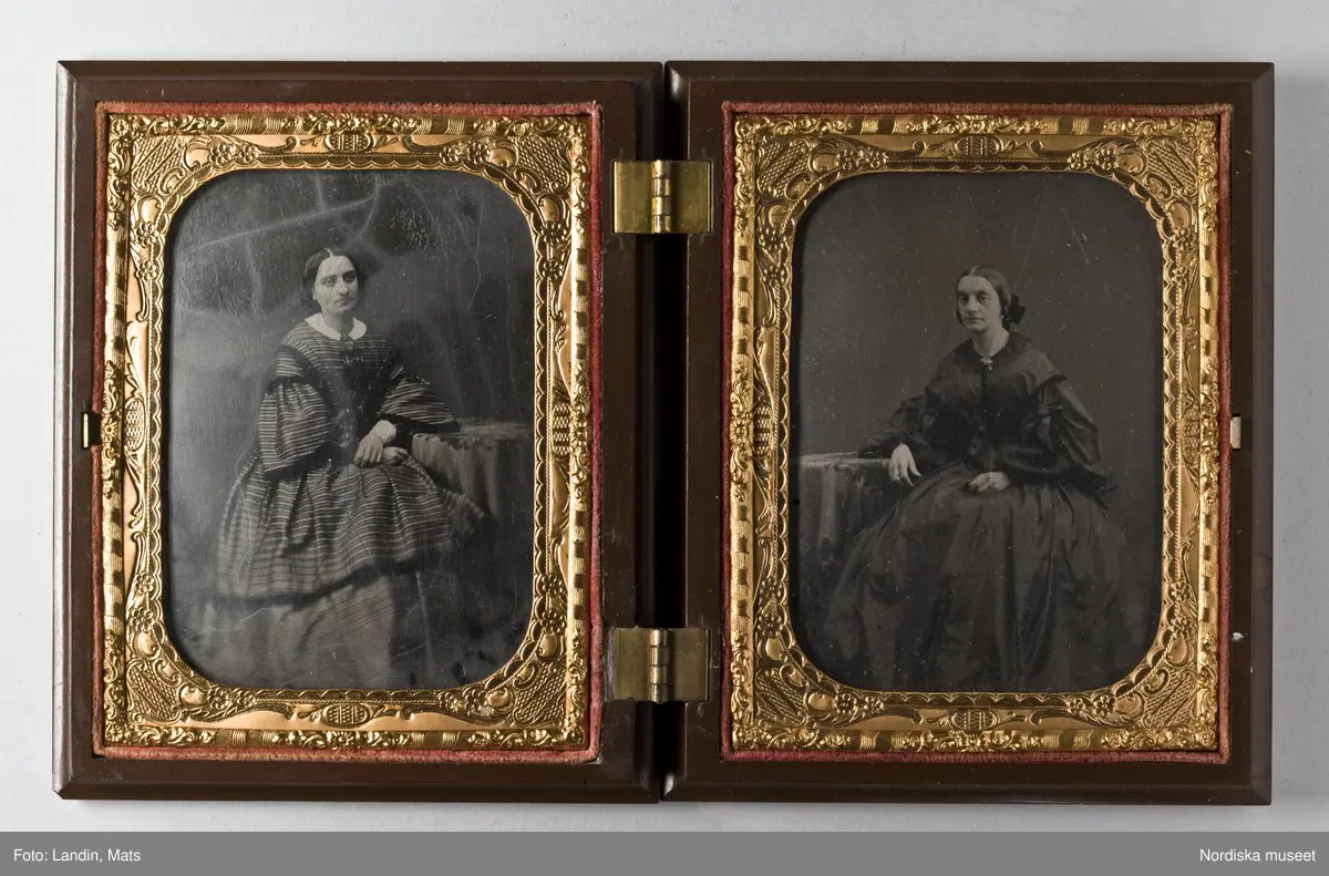 Porträtt, två stycken i etui, av fröknarna Fredrique och Ida Freese, döttrar till kyrkoherden i Tyska församlingen i Stockholm. Panotypi. Nordiska museet inv.nr 192070.