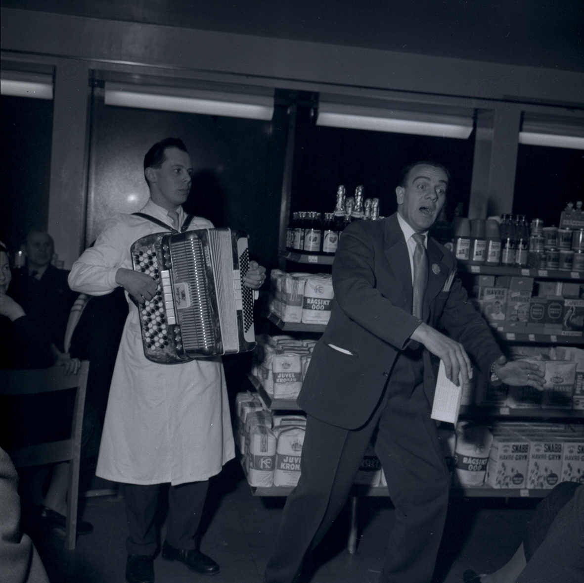 En man i vit rock som spelar dragspel och en man i kostym som gör något framträdande.