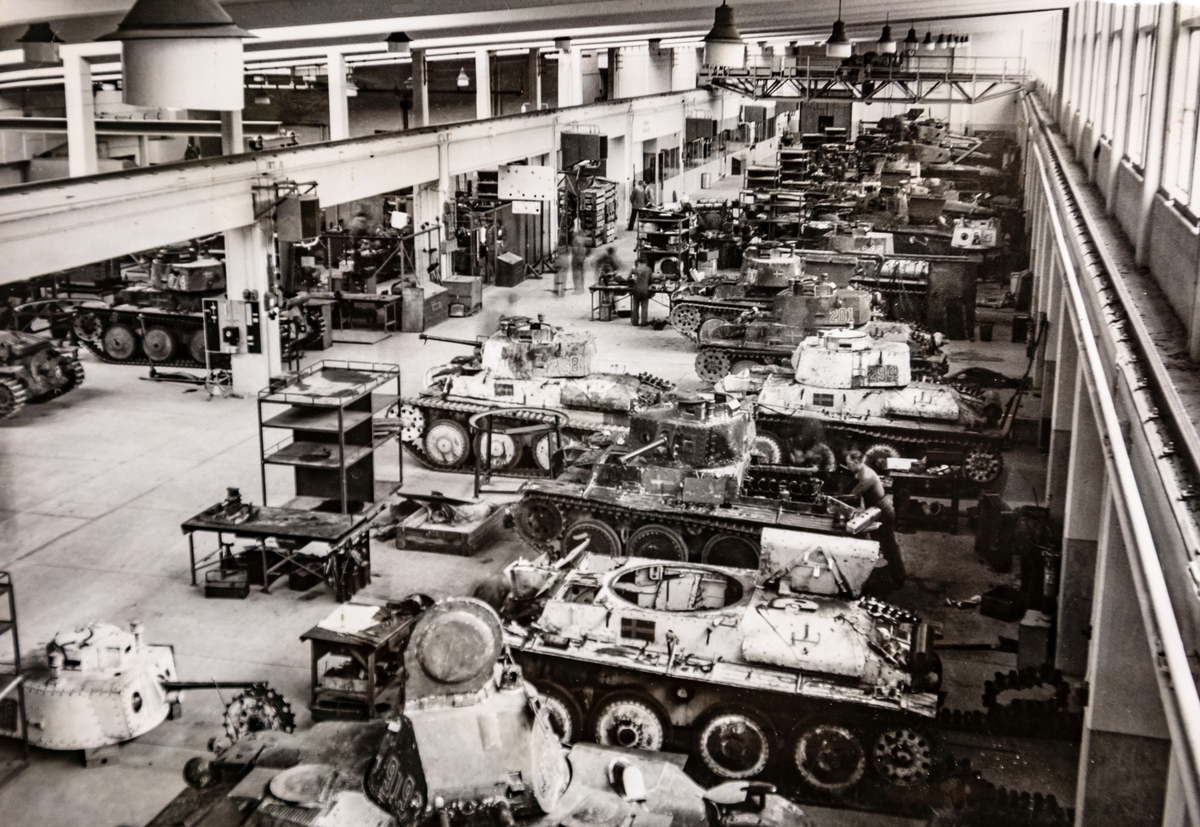 Översiktsbild med Pansarbil m/39 Lynx i förgrunden, sen Strv m/41 och Strv m/42 längre bak i verkstaden.