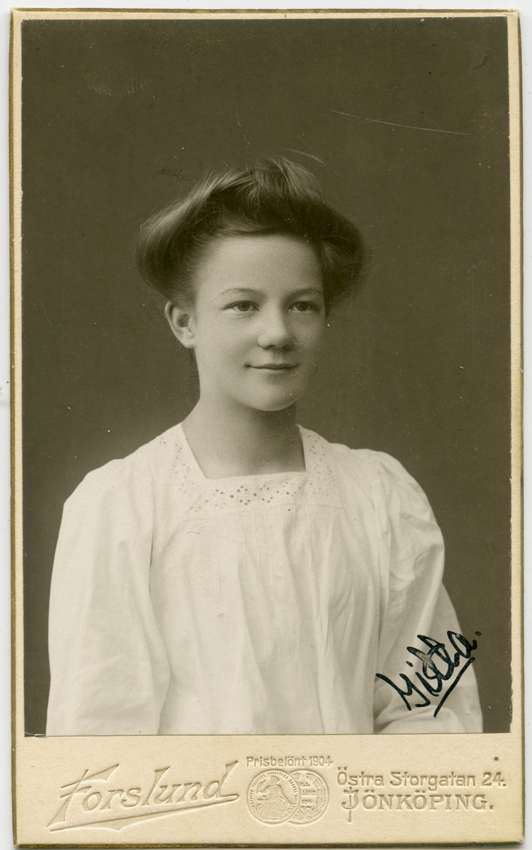 Porträtt på Gitta Platon Apotekare. Skene. Slutade Jönköpings Elementarskola för flickor år 1905.