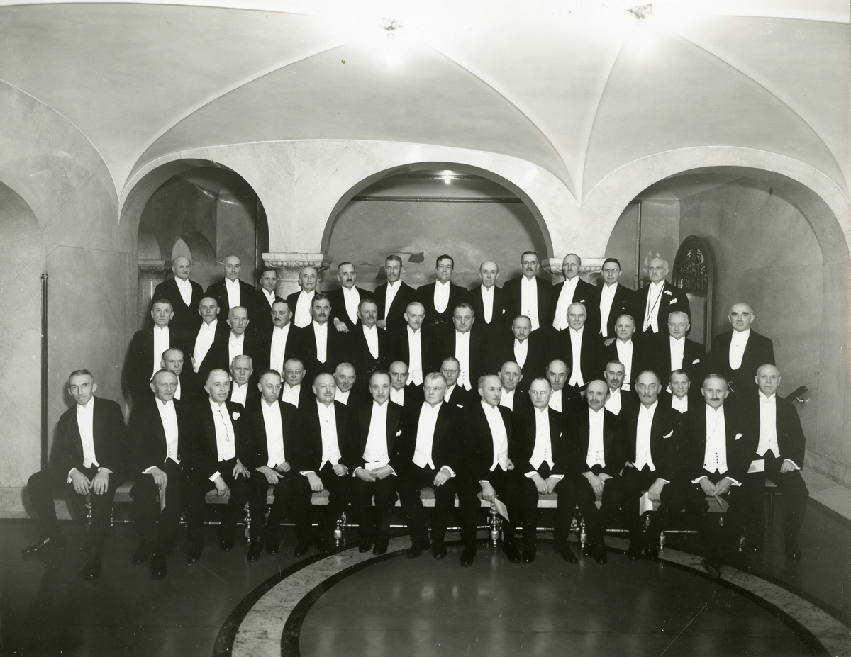 Grupporträtt av gamla officerare samlade på Grand Hotel Royal vid 40-års jubileum av officersexamen 1936.