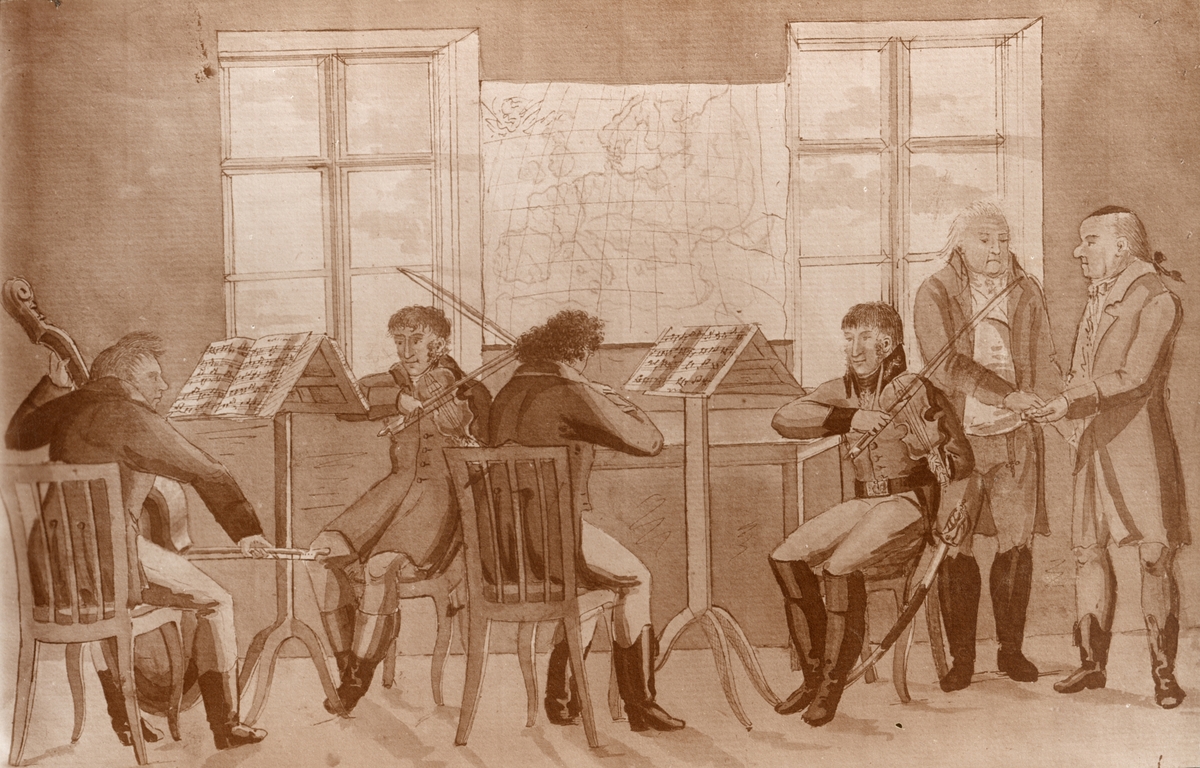 Text i fotoalbum: "Fotografi efter en tavla uti Kungl. Krigskolans officersmäss, skänkt dit år 1899 af. d. v. kompaniofficeren löjtnant C. A. Forsberg (ättling af Kamreren vid Kungl. Krigsakademin C. Forsberg. Taflan (akvarell) är målad år 1810 af d. v. kadetten vid Kungl. Krigsakademin Jacob Otto Natt och Dag. Anteckningarna å densamma å andra sidan äro verkställda af Kamreren vid Kungl. Krigsakademin C. Forsberg".