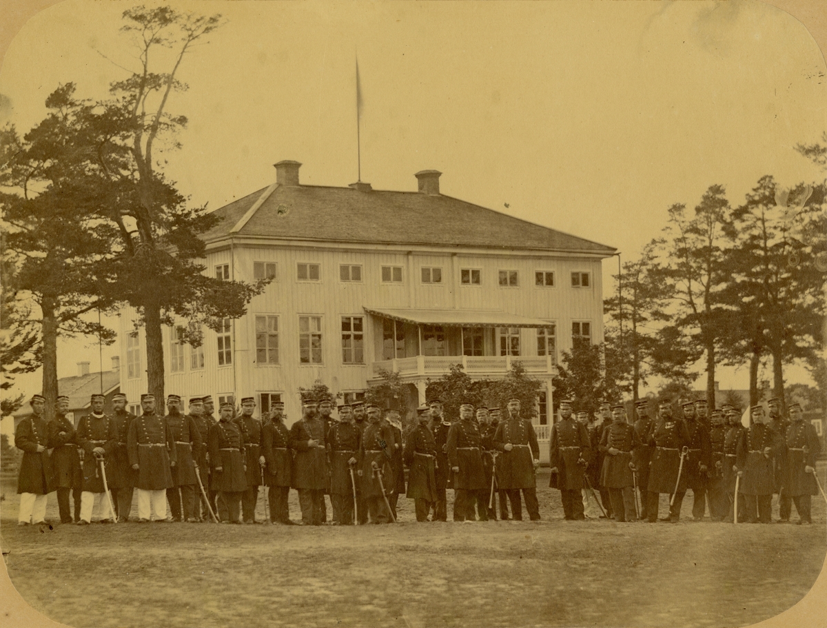 Grupporträtt av Hälsinge regemente I 14 utanför officerspaviljongen Mohed.