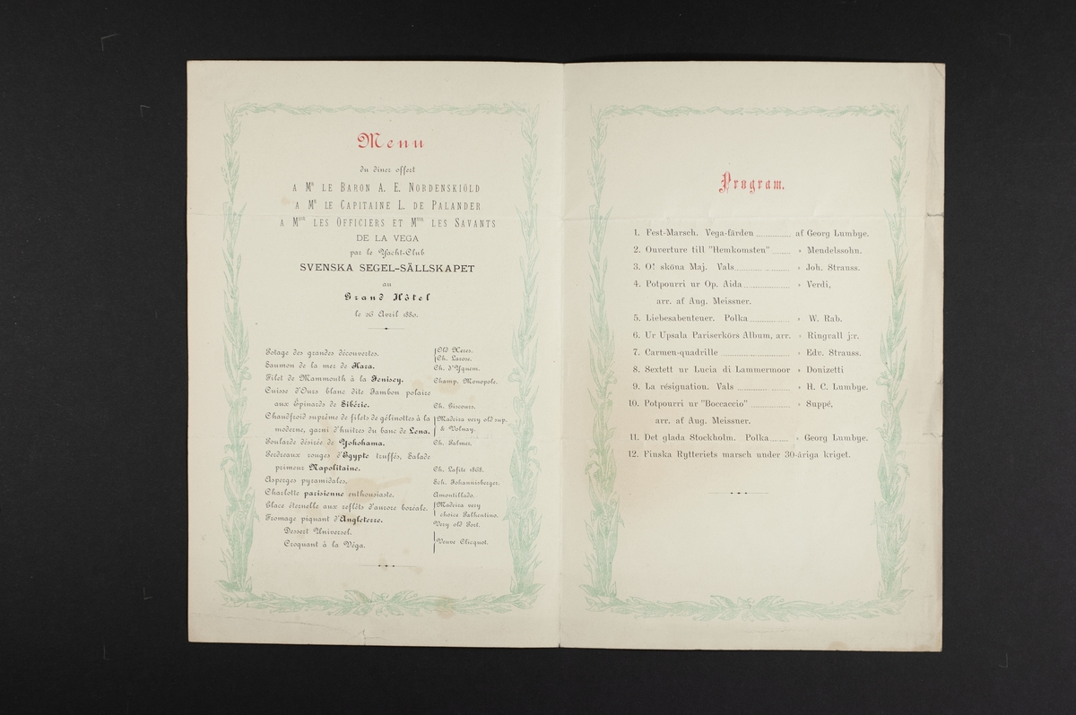 Illustrerad trycksak: meny och musikprogram för Svenska Segel-sällskapets festligheter på Grand Hotel den 26 april 1880, till ära för A. E. Nordenskiöld, L. de Palander och besättningen på skeppet Vega.