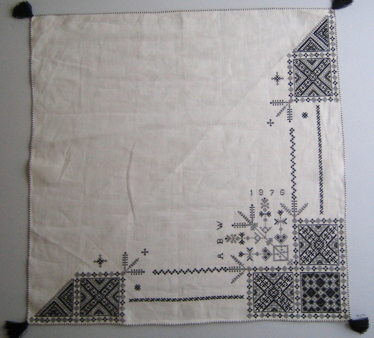 Geometriskt mönster i kvadrater i hörnen. Två bårder mellan kvadraterna på ryggsnibb och framsnibbar. På ryggsnibben tre kvadrater och en majstångsspira samt märkning med årtal och initialer. På varje framsnibb en kvadrat och en trekant. Sex ornament.