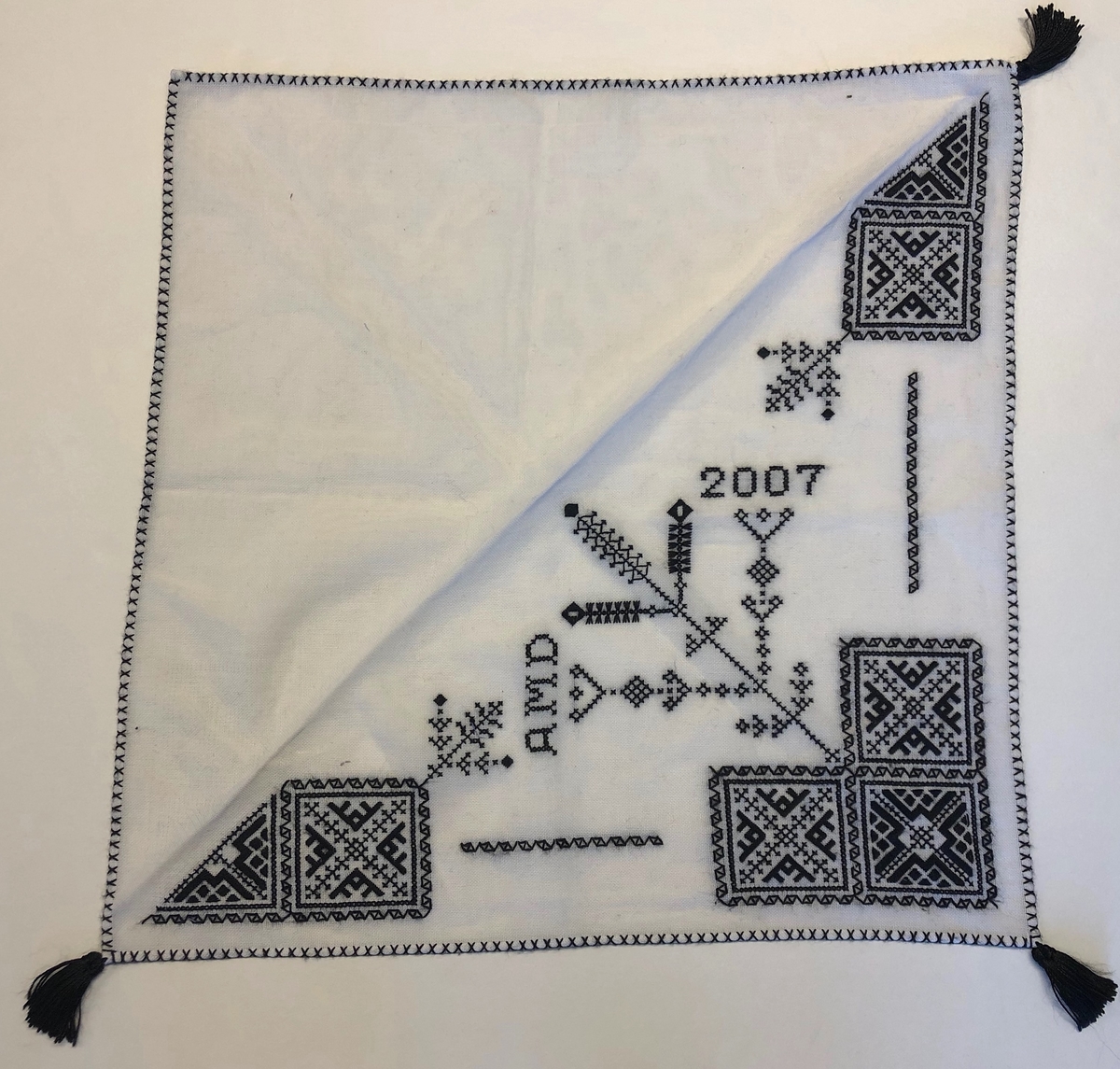 Titel: Geometriskt mönster i kvadrater i hörnen. En bård mellan kvadraterna på ryggsnibb och framsnibbar. På ryggsnibben tre kvadrater och en majstångsspira samt märkning med årtal och initialer. På varje framsnibb en kvadrat och en trekant.