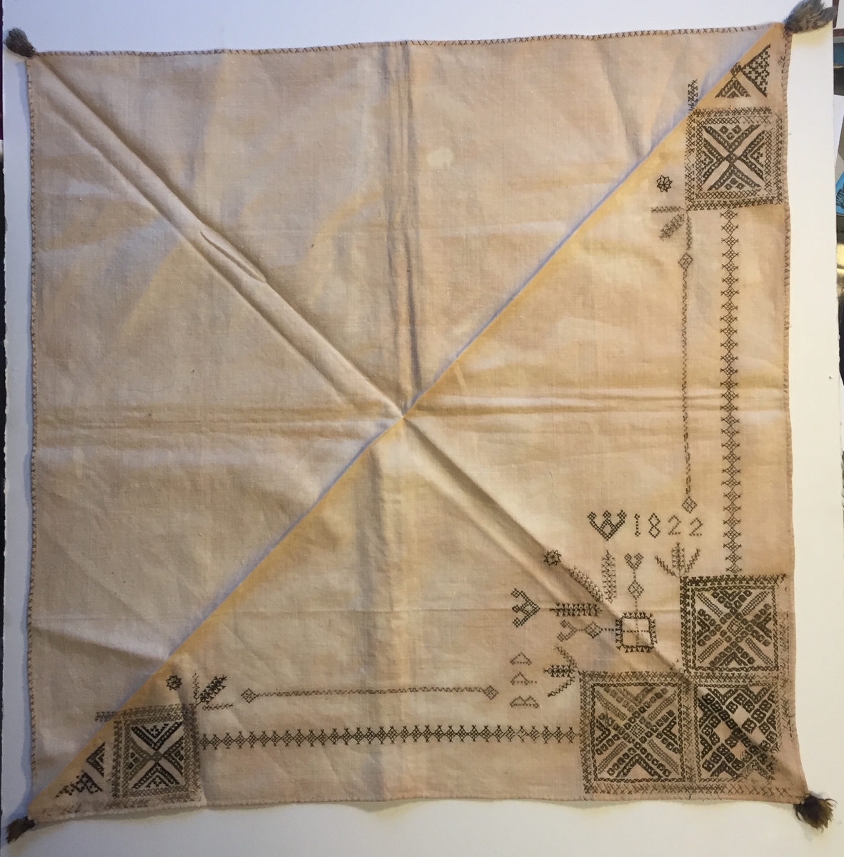 Geometriska mönster i kvadrater i hörnen, bårder mellan kvadraterna på ryggsnibb och framsnibbarna. På ryggsnibben tre kvadrater och ett kvistmönster samt märkning med årtal och initialer. På varje framsnibb en kvadrat och en trekant.