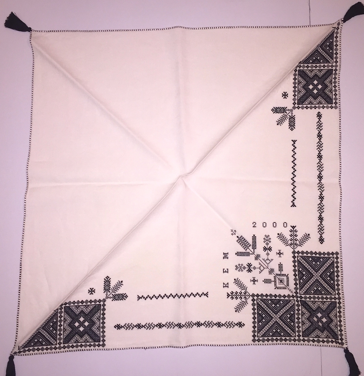 Geometriskt mönster i kvadrater i hörnen. Två bårder mellan kvadraterna på ryggsnibb och framsnibbar. På ryggsnibben tre kvadrater och en majstångsspira samt märkning med årtal och initialer. På varje framsnibb en kvadrat och en trekant. Fyra ortnament.