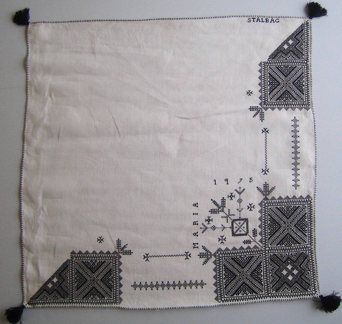 Geometriskt mönster i kvadrater i hörnen. Två bårder mellan kvadraterna på ryggsnibb och framsnibbar. På ryggsnibben tre kvadrater och en majstångsspira samt märkning med årtal och namn. På varje framsnibb en kvadrat och en trekant. Sex ornament.