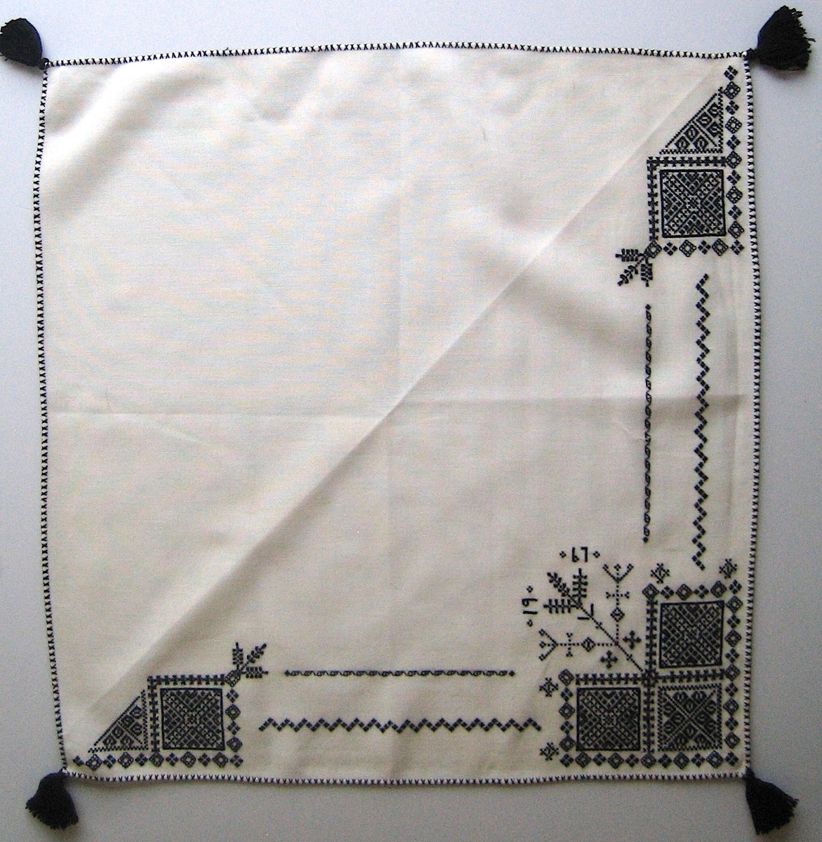 Geometriskt mönster i kvadrater i hörnen. Två bårder mellan kvadraterna på ryggsnibb och framsnibbar. På ryggsnibben tre kvadrater och en majstångsspira samt märkning med årtal. På varje framsnibb en kvadrat och en trekant. Sex ornament.
