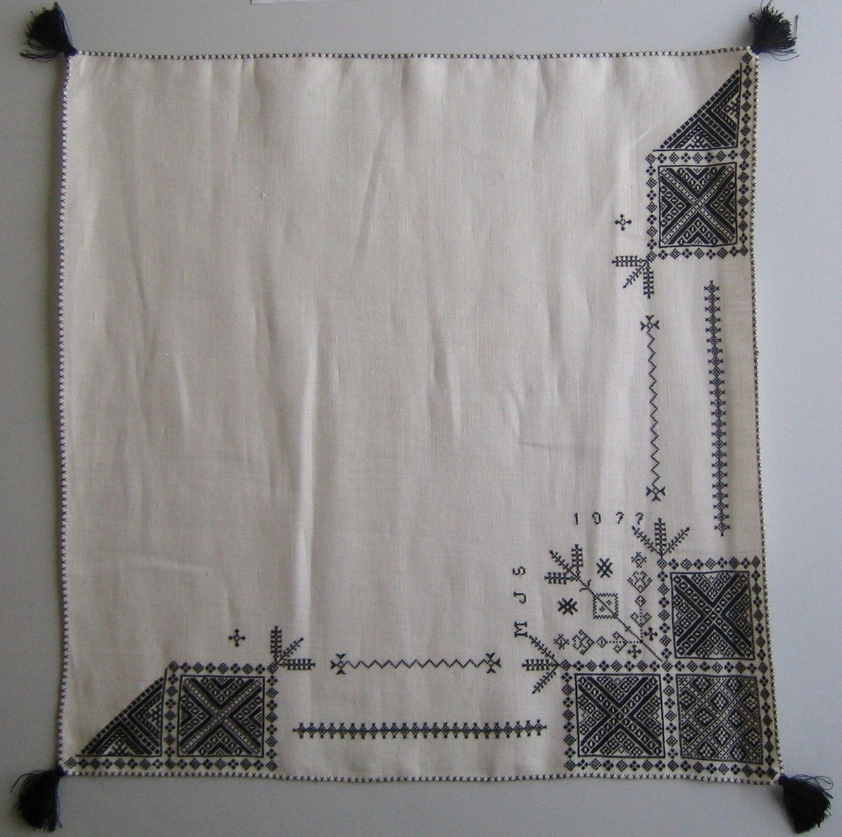 Geometriskt mönster i kvadrater i hörnen. Två bårder mellan kvadraterna på ryggsnibb och framsnibbar. På ryggsnibben tre kvadrater och en majstångsspira samt märkning med årtal och initialer. På varje framsnibb en kvadrat och en trekant. Sex ornament.