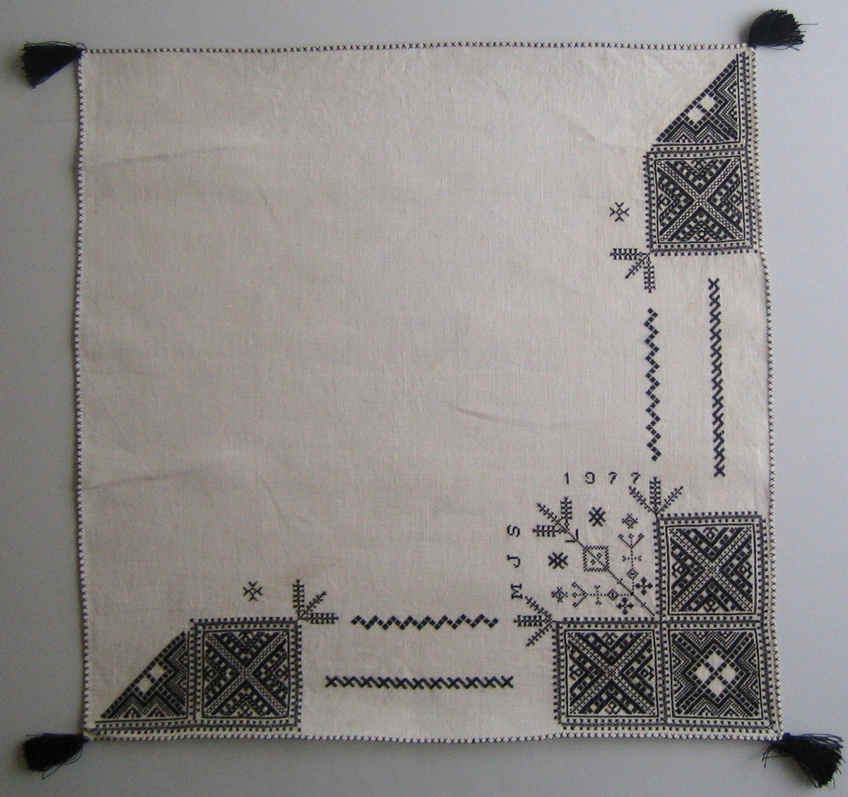 Geometriskt mönster i kvadrater i hörnen. Två bårder mellan kvadraterna på ryggsnibb och framsnibbar. På ryggsnibben tre kvadrater och en majstångsspira samt märkning med årtal och namn. På varje framsnibb en kvadrat och en trekant. Sex ornament.