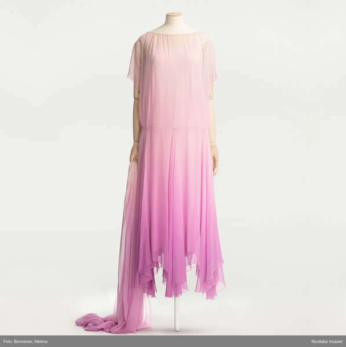 Klänning av tyll i olika rosa toner, monterad på docka. Originalmodell uppsydd hos Madeleine Vionnet i Paris i början av 1920-talet. Troligen köpt av Sonja Wessman född Suber (1891-1976) på NK:s Franska damskrädder i slutet av säsongen när modellplaggen såldes till nedsatt pris. I Skansens samlingar. SKAKLK.0010152.