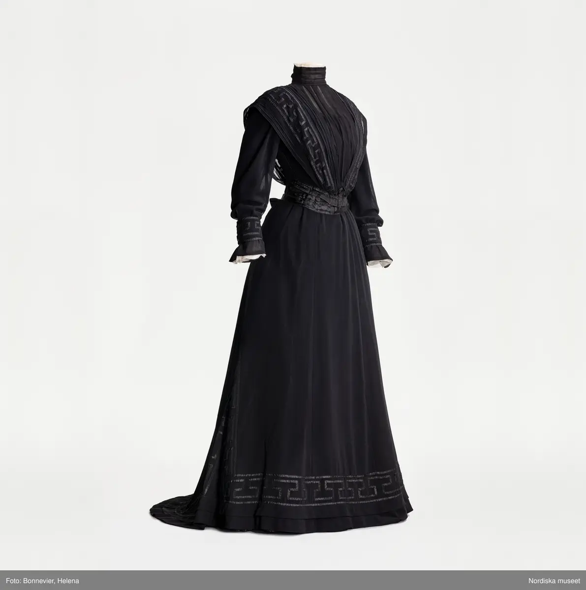Tvådelad svart sorgklänning i jugendstil monterad på docka. NK:s franska damskrädderi. Korsetterad dräkt i tidens S-silhuett med fotsid kjol. Beställd av Hanna Palme född von Born (1861-1959) samhällsaktivist, dräktreformist och farmor till Olof Palme, Sveriges stadsminister 1969-1976. Levererad ca 1902-1910. I Sörmlands museum, SLM 9815.