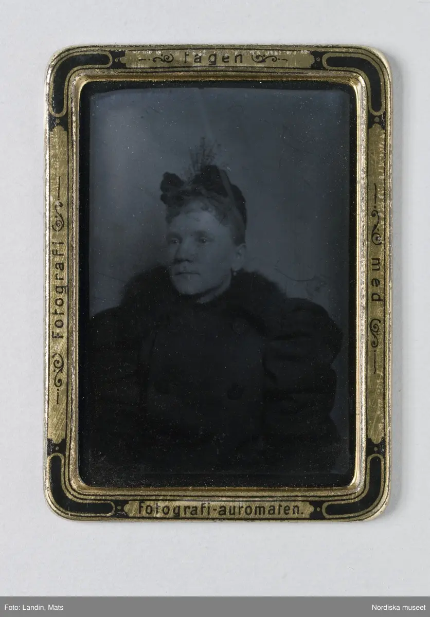 Porträtt av dam i ytterkläder och hatt, uppfäst på en metallplåt; på dess baksida bild av Industripalatset; inskr. 'Minne av Industripalatset' / 'Fotografi tagen med fotografiautomaten'; i fodral av vit papp, tryckt text: 'Industripalatset / Stockholm / Fotografi-Automat / Bosco / nyaste uppfinning / Bilden bör icke torka i solen / Bildytan får ej vidröras förrän den är torr.' Ferrotyp.