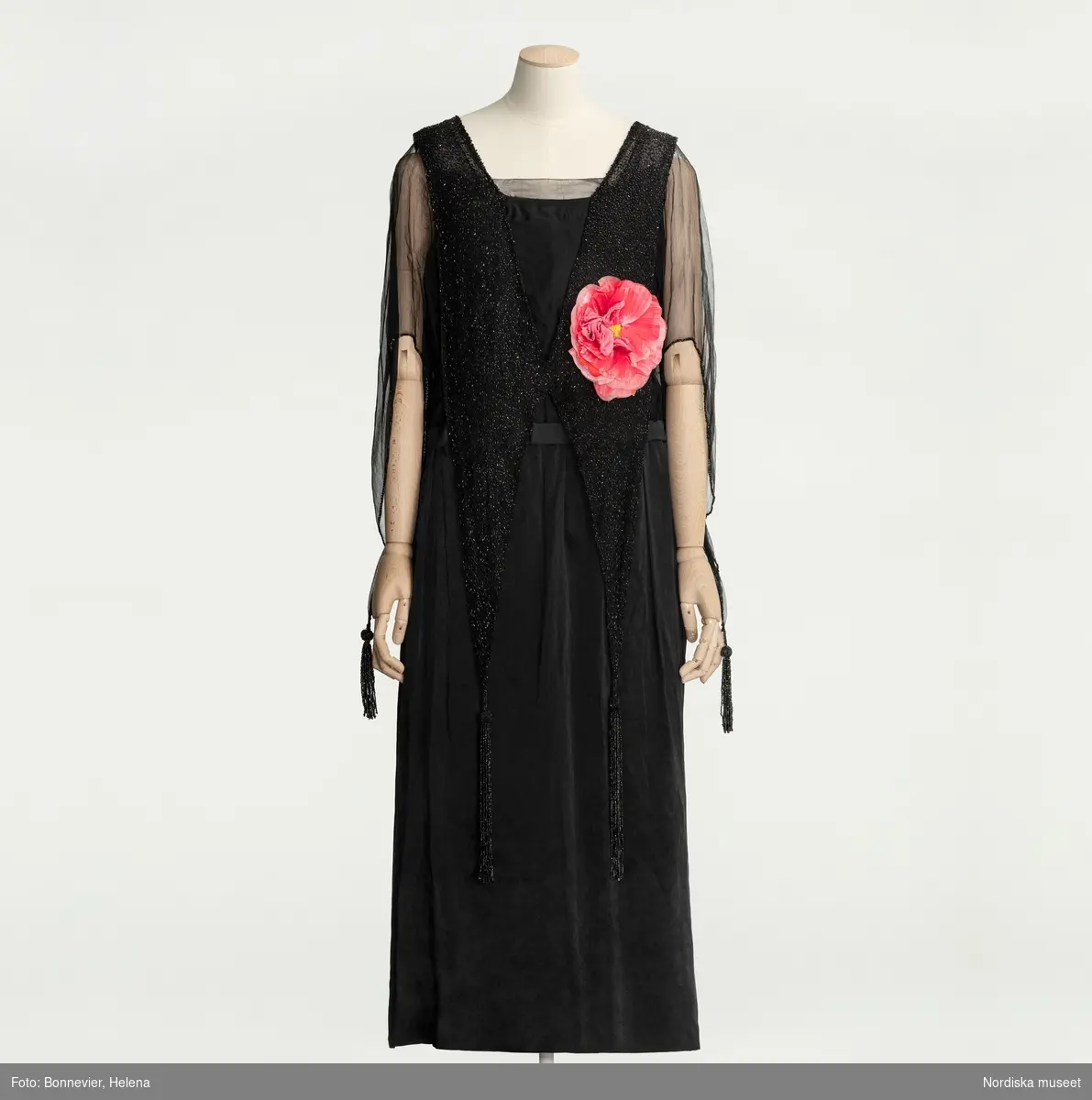 Klänning, monterad på docka, av svart siden med stråpärlbroderier, corsage, rosa ros av tyg. Beställd från NK:s Franska damskrädderi av Agnes Sutthoff född Skogman (1874-1956), textilkonstnär för Handarbetets Vänner (HV) och Nordiska Kompaniet (NK), levererad 1919.
