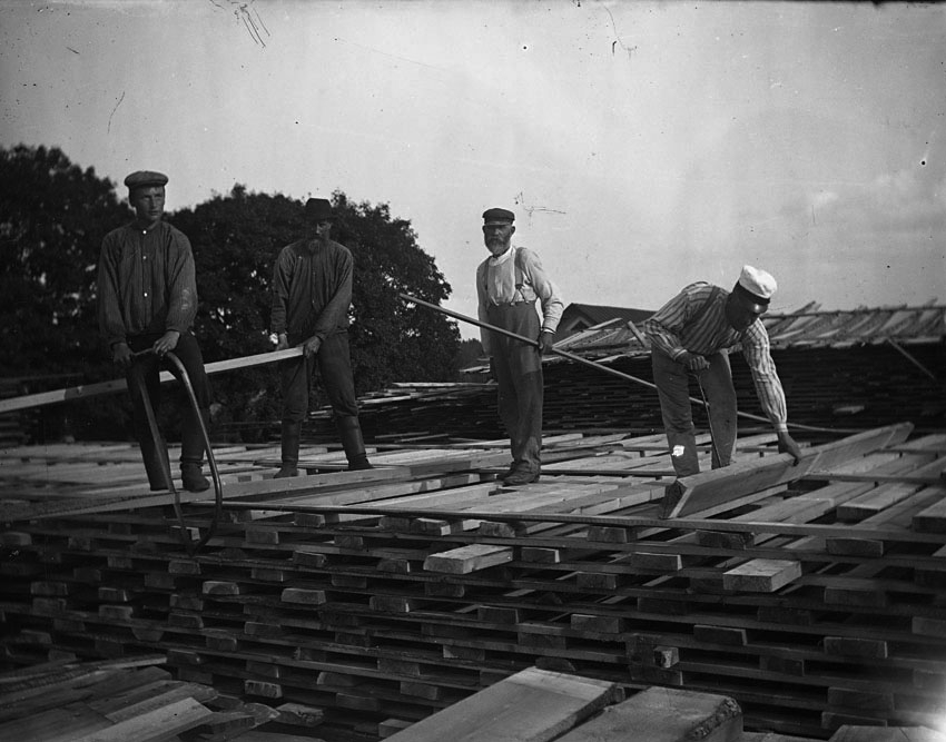 Fyra män som arbetar med stapelläggning, Västmanland.