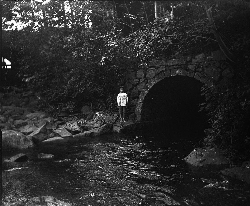 Pojke vid stenbro över fors.