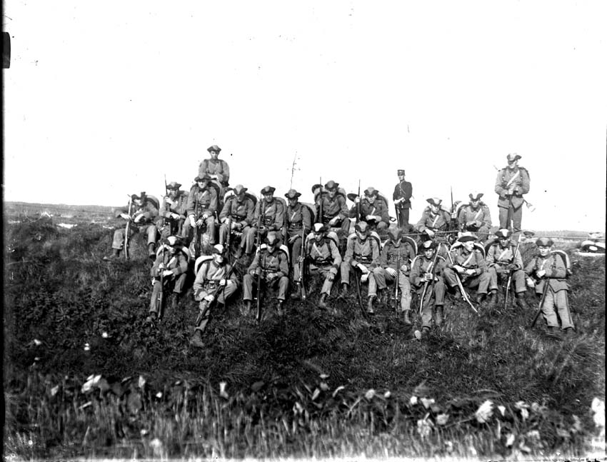 Grupporträtt på värnpliktiga, i stridsutrustning, från I 18 i Västerås.