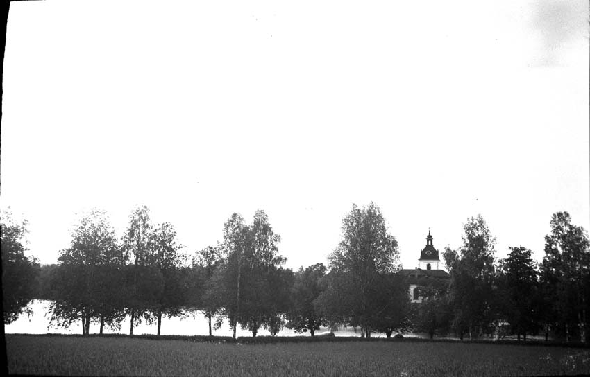 Vy över landskap, med en sjö och kyrka i bakgrunden.