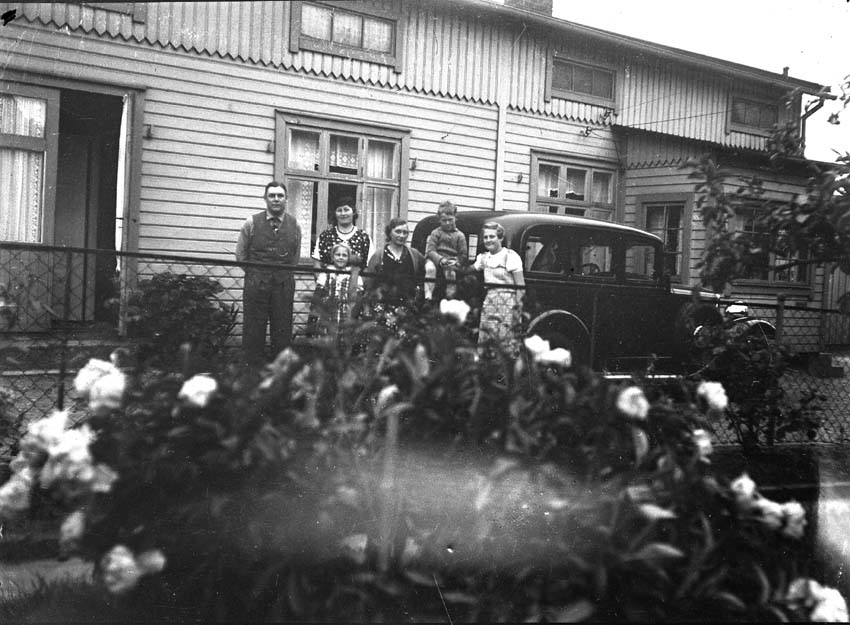 Grupporträtt bredvid en bil, i bakgrunden ett bostadshus.