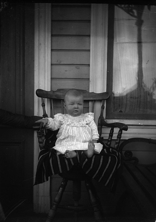 Titel: Maja Lindgren i stol på veranda.