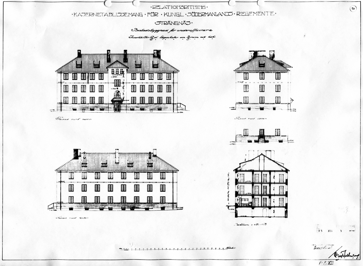 Här visas tre relationsritningar över byggnad K0074-013 ursprungligen planerad som regementets sjukhus under 1910-talet.