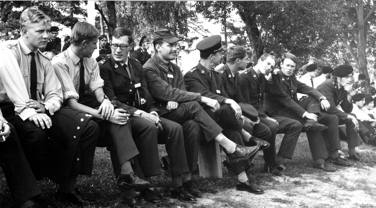 Bild 1 Några befäl fångade på bild frv överfurir Krister Eriksson, furir Kjell Jacobsson, fänrik Arne Hjellström, löjtnant Mats Torping, kapten Curt Halldén, fänrikarna Alf Sandqvist, Leif Ekblom (fd Karlsson), Börje Carlsson.