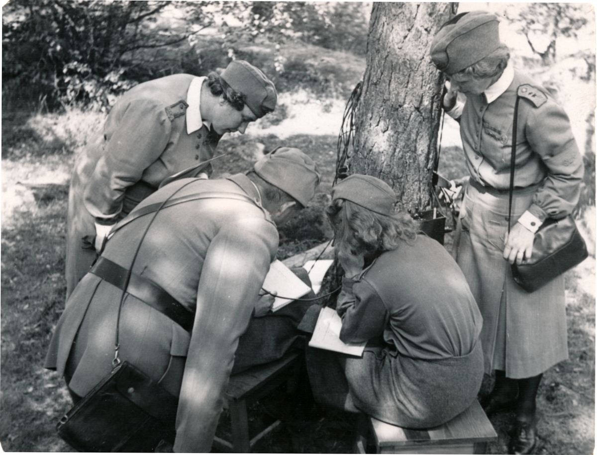 Bild 1. Examensprov med sambandslinjen. Fr v rikslottachefen fru Märta Stenbäck, ryggen på C P 3 överste Eric Cavalli, t h chefslottan Maj Cederlund.