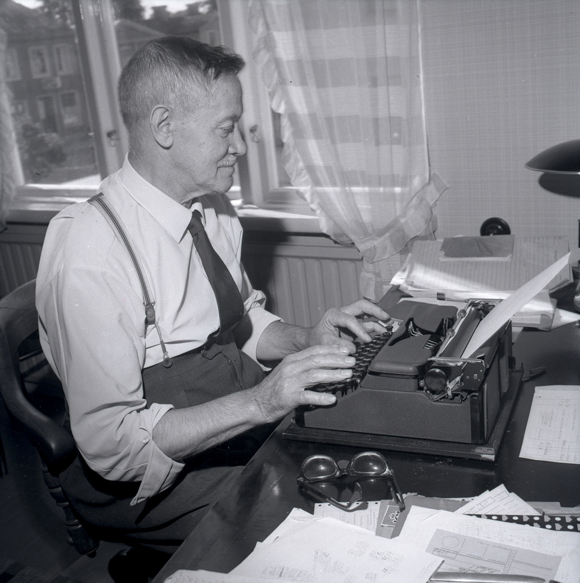 Axel Nilsson sitter vid en arbetsbänk med skrivmaskin och dokument, Borgholm.