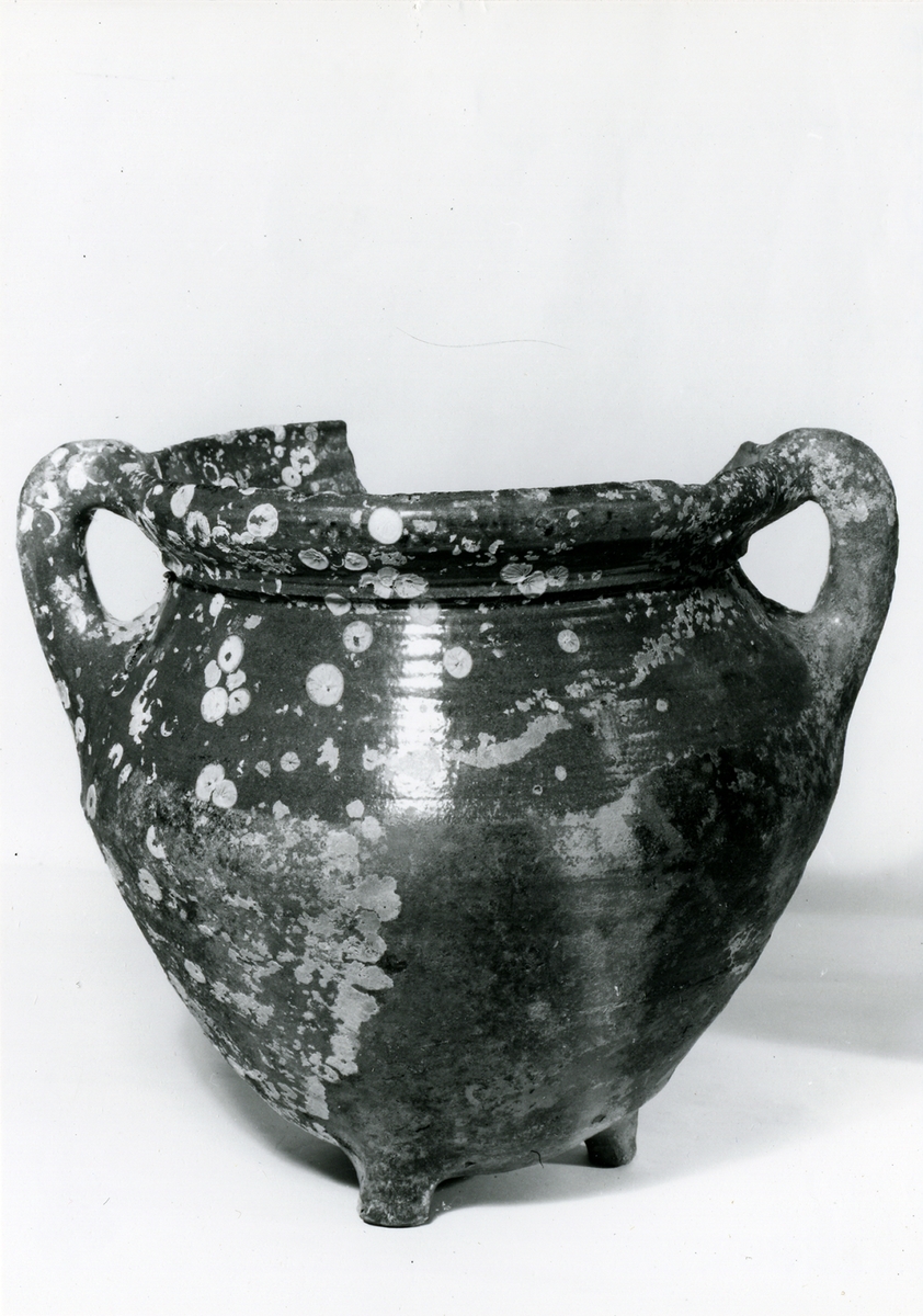 "Brunt glaserad invändigt och utvändigt ned till bukvinkeln. Höjd 28 cm, mynningsdiameter 24 cm. Mynningspartiet utvikt, varför största vidd c:a 20 cm, handtagets längd c:a 11 cm."