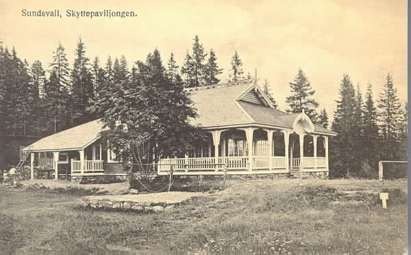 Vykort med motiv från Norra Berget, Sundsvall. Skyttepaviljongen, vinterbild från Norra berget, interiör.