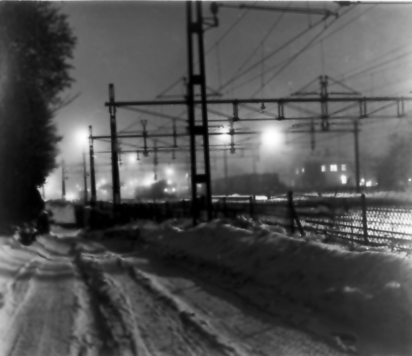 "Bangården en vinterkväll". Från utställningen "Falköping i bild" 1952.
