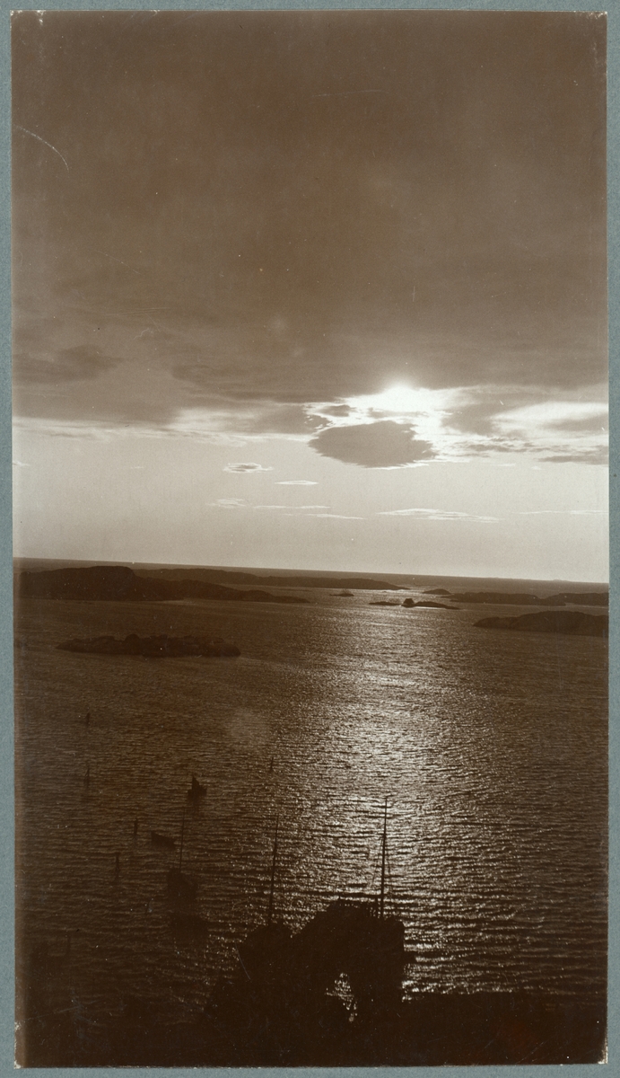 Motiv från Bohuslän. Solnedgång från Korpåsberget över Bottnafjorden och havet