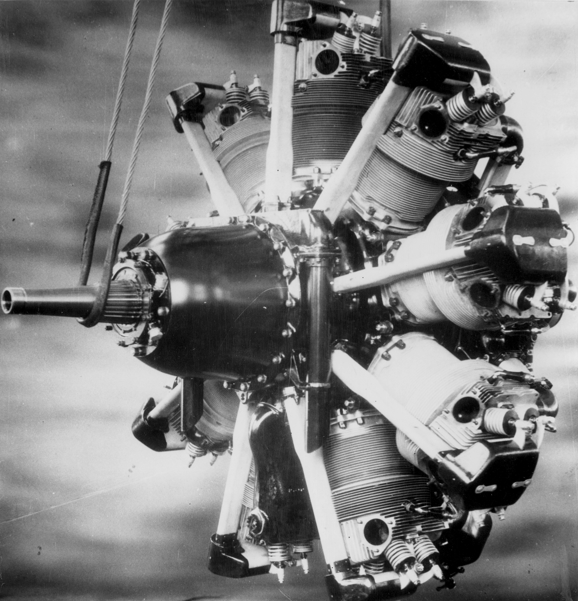 Flygmotor Mercury S2 Nohab (My S2), tillverkad 1939 för flygplan J 8. Monterat foto med tillhörande information.
